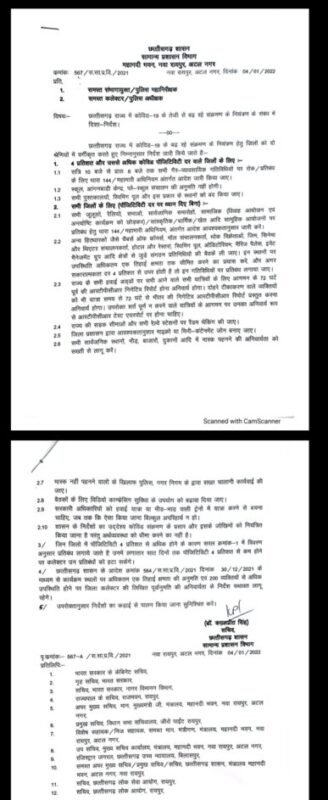 1. सभी जुलूसों,रैलियों,सभाओं, सार्वजानिक समारोहों,सामाजिक कार्यक्रम (विवाह एवं अन्त्यष्टि कार्यक्रम को छोड़कर) सांस्कृतिक,धार्मिक, खेल आदि सामूहिक आयोजनों में प्रतिबंध ।
