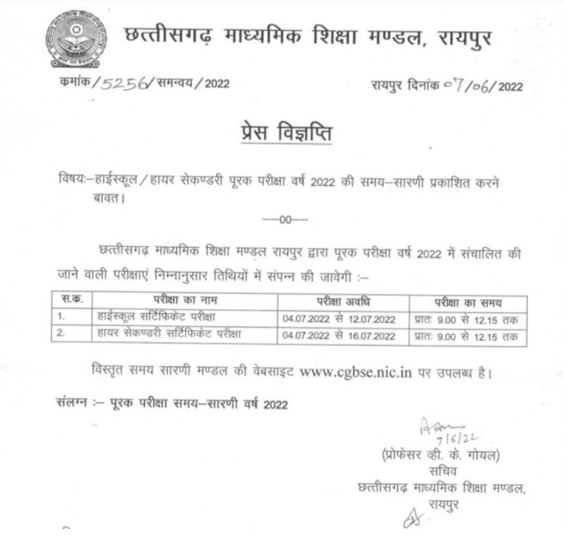 रायपुर। छत्तीसगढ़ माध्यमिक शिक्षा मंडल ने मंगलवार को दसवीं और बारहवीं बोर्ड के पूरक परीक्षा की समय सारणी जारी की. समय सारणी के मुताबिक पूरक परीक्षा 4 जुलाई से प्रारंभ होगी, जो 12 जुलाई तक चलेगा।