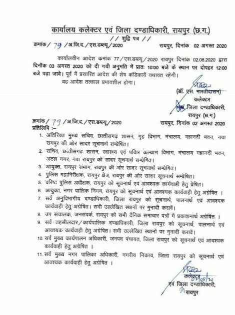 कलेक्टर एस. भारती दासन ने यह आदेश दिया है। आदेश में कहा गया है कि फेस मॉस्क के उपयोग तथा फिजिकल डिस्टेंसिंग रखने के संबंध में समय-समय पर छत्तीसगढ़ शासन द्वारा जारी दिशा निर्देशों का अनिवार्य रूप से पालन करने की शर्त पर 3 अगस्त को सुबह 6 से 12 बजे तक (1 दिन ) तक राखी एवं मिठाई के विक्रय की अनुमति प्रदान की जाती है। पूर्व में प्रसारित आदेश की शेष कंडिकाएं यथावत रहेंगी। यह आदेश तत्काल प्रभावशील होगा।