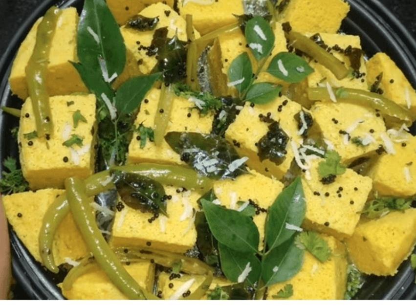 बघार के लिए एक चम्मच तेल में राई, हींग मीठा नीम घोकला की को कटने के साथ ही इसे ऊपर से डालें।