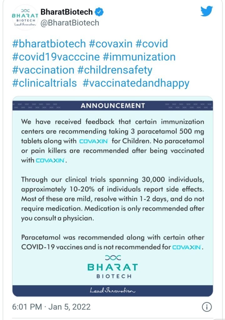 भारत बायोटेक द्वारा जारी बयान के अनुसार पेरासिटामोल या पेन किलर दवाएं उन बच्चों के लिए ठीक नहीं हैं जिन्हें COVAXIN का टीका लगाया जा रहा है, भारत बायोटेक का कहना है कि चिकित्सक के परामर्श के बाद ही कोई दवाई खिलाएं।
