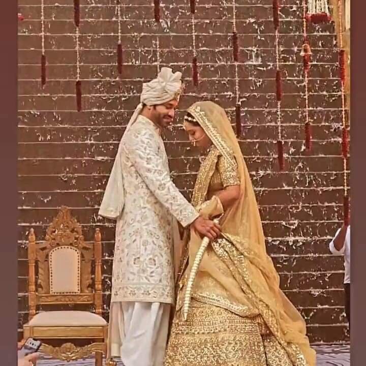 शादी की आयी तस्वीरों में विक्की ऑफ वाइट शेरवानी में नजर आ रहे हैं। वहीं अंकिता गोल्डन कलर के खूबसूरत लहंगे में दिख रही हैं।हाथों में मेहंदी, हैवी ज्वैलरी, मांग टीका दुल्हन बनी अंकिता के लुक को चार-चांद लगा रहा है।
