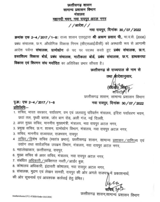 रायपुर। भारतीय वन सेवा के अवसर अरुण प्रसाद पी को संचालक उद्योग की जिम्मेदारी दी गई है। साथ ही एमबी हस्तशिल्प विकास बोर्ड माटी कला बोर्ड, माटी कला बोर्ड व एमडी हथकरघा विकास एवं विपणन संघ का प्रभार भी सौंपा गया है।