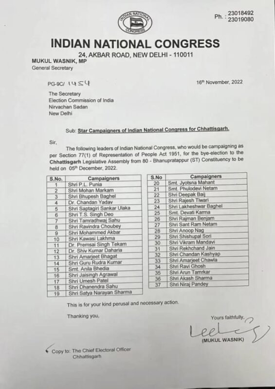 कांग्रेस की स्टार प्रचारकों की सूची में भूपेश बघेल, मोहन मरकाम, प्रभारी महामंत्री अमरजीत चावला समेत टीएस सिंहदेव का नाम सहित 37 स्टार प्रचारकों ने नाम शामिल है। एआईसीसी ने लिस्ट जारी की।