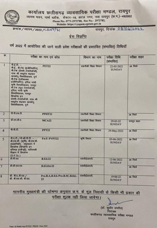 व्यापमं द्वारा जारी तिथि के अनुसार प्री-इंजीनियरिंग टेस्ट (पीईटी) व प्री फॉर्मेसी टेस्ट (पीपीएचटी) आगामी 22 मई को आयोजित किया जाना प्रस्तावित है। यह परीक्षा राज्य के सभी 28 जिलों में आयोजित की जाएगी। पीईटी के माध्यम से बीई, बीटेक (इंजीनियरिंग), बीटेक डेयरी टेक्नॉलाजी, दाउ श्री वासुदेव चन्द्राकर विश्वविद्यालय दुर्ग, बीटेक एग्रीकल्चर इंजीनियरिंग, बीटेक फूड टेक्नॉलाजी, डिप्लोमा इन डेयरी टेक्नॉलाजी में प्रवेश लिया जाएगा। वहीं प्री एमसीए व प्री पॉलिटेक्निक टेस्ट (पीपीटी) 29 मई को होना प्रस्तावित है। इसी तरह बीएससी कृषि, बीएससी उद्यानिकी, पशुपालन एवं डिप्लोमा एवं मात्सिकीय विज्ञान एवं डिप्लोमा पाठ्यक्रम में प्रवेश के लिए प्री एग्रीकल्चर टेस्ट (पीएटी) और प्री वेटनरी टेस्ट (पीव्हीपीटी) का आयोजन 5 जून को प्रस्तावित है। प्री बीएड व प्री डीएलएड परीक्षाएं 12 जून को आयोजित होंगी। वहीं प्री बीए बीएड तथा बीएससी बीएड के लिए प्रवेश परीक्षा 19 जून को प्रस्तावित किया गया है। गौरतलब है कि बस्तर एवं सरगुजा के निवासियों की भर्ती के लिए गठित कनिष्ठ सेवा चयन बोर्ड की परीक्षाओं में भी शुल्क माफ कर दिया गया है।