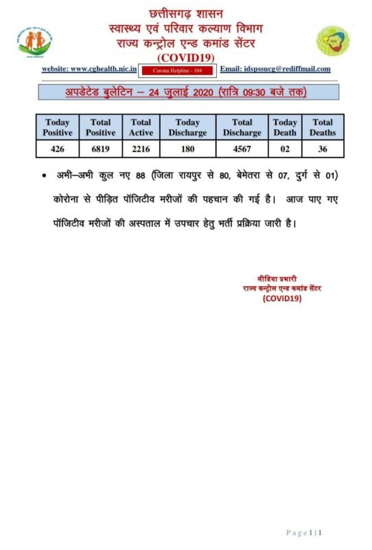 रायपुर जिले में पहला केस 18 मार्च 2020 -24 जुलाई तक कुल संक्रमितों की संख्या 1774 -स्वस्थ हुए 778, कुल एक्टिव मरीज 981 (24 जुलाई को)
