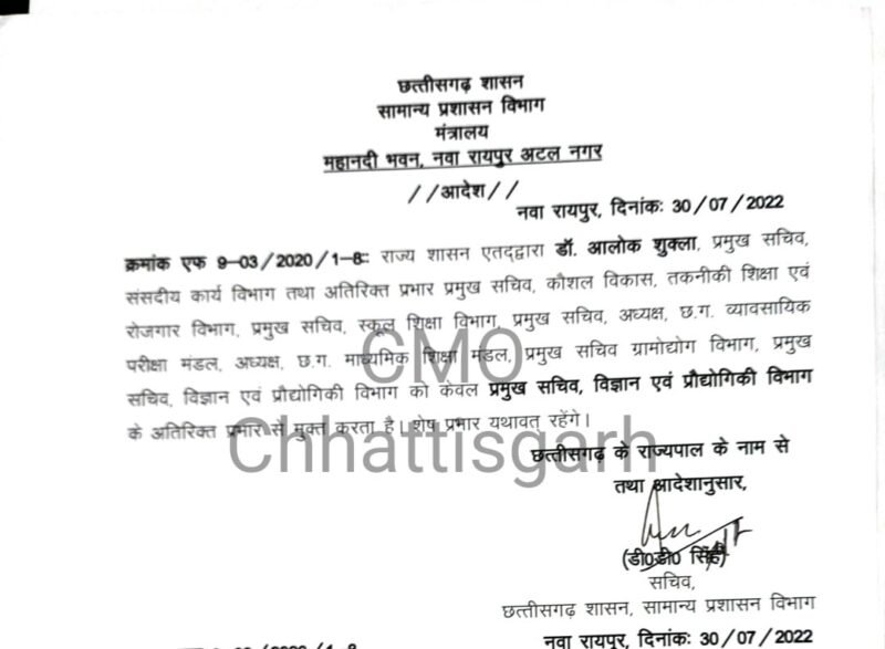 इसी के साथ डा. आलोक शुक्ला प्रमुख सचिव संसदीय कार्य विभाग तथा अतिरिक्त प्रभार प्रमुख सचिव, कौशल विकास, तकनीकी शिक्षा एवं रोजगार विभाग, प्रमुख सचिव स्कूल शिक्षा विभाग, प्रमुख सचिव अध्यक्ष छग व्यावसायिक परीक्षा मंडल, अध्यक्ष छग माध्यमिक शिक्षा मंडल, प्रमुख सचिव ग्रामोद्योग विभाग, प्रमुख सचिव विज्ञान एवं प्रौद्योगकी विभाग को केवल प्रमुख सचिव विज्ञान एवं प्रौद्योगकी विभाग के अतिरिक्त प्रभार से मुक्त कर दिया गया है।
