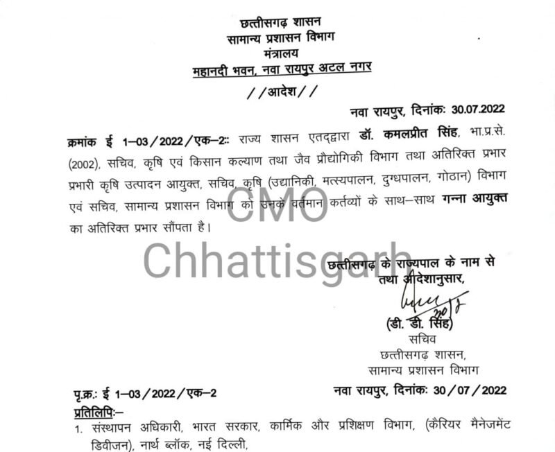 जारी आदेश के मुताबिक डा. कमलप्रीत सिंह सचिव, कृषि एवं किसान कल्याण तथा जैव प्रौद्योगिकी विभाग तथा अतिरिक्त प्रभार प्रभारी कृषि उत्पादन आयुक्त, सचिव कृषि (उद्यानिकी, मत्स्य पालन, दुग्ध पालन, गोठान) विभाग एवं सचिव, सामान्य प्रशासन विभाग को उनके वर्तमान कर्तव्यों के साथ गन्ना आयुक्त का अतिरिक्त प्रभार सौंपा गया है।