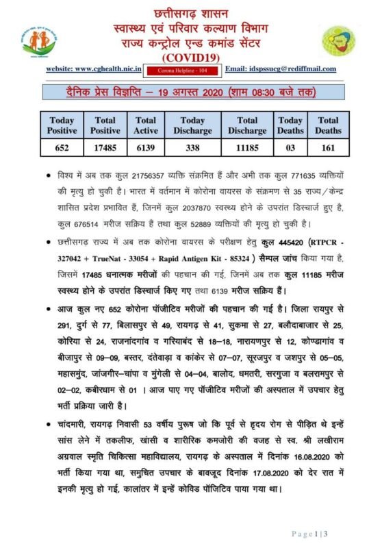 आज स्वास्थ्य विभाग ने मेडिकल बुलेटिन जारी कर प्रदेश में कोरोना की स्थिति को लेकर जानकारी दी है। जारी बुलेटिन के अनुसार प्रदेश में आज कुल 652 नए मामले सामने आए हैं और 338 लोग डिस्चार्ज हुए हैं। वहीं आज 3 कोरोना संक्रमित की मौत हो गई। इसके साथ ही छत्तीसगढ़ कोरोना मरीजों की मौत के मामले में शतक पार कर लिया है।