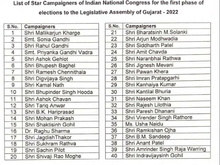 आपको बता दें स्टार प्रचारकों में कांग्रेस अध्यक्ष मल्लिकार्जुन खड़गे, सोनिया गांधी, राहुल गांधी, प्रियंका गांधी, छत्तीसगढ़ के सीएम भूपेश बघेल समेत 40 नेताओं के नाम शामिल हैं।