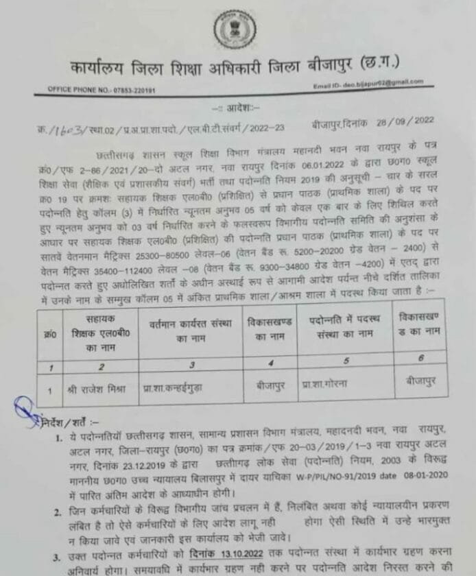 रायपुर। शिक्षा विभाग में थोक में तबादले हुए हैं। सहायक शिक्षकों की पदोन्नति की गई है। बस्तर संभाग के शिक्षकों का प्रमोशन आदेश जारी किया गया है। बीजापुर के 556 सहायक शिक्षकों का सहायक शिक्षक से प्रधान पाठक में पदोन्नति की गई है।
