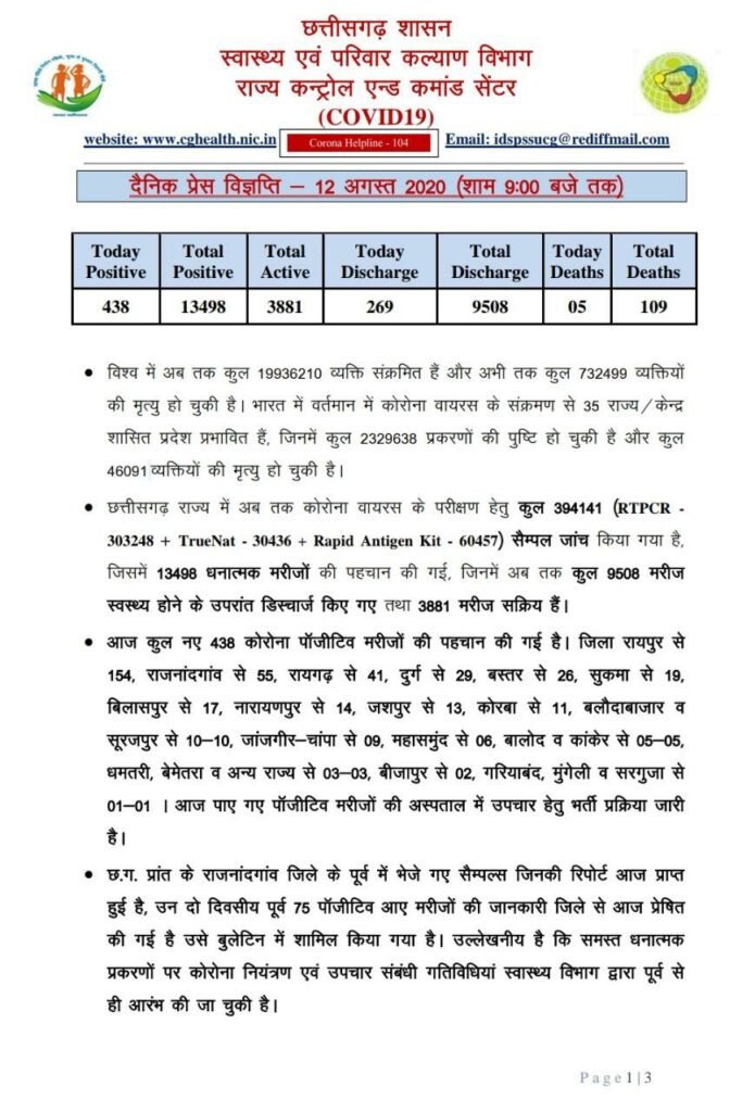 रायपुर। आज भी कोरोना मरीजों में तेज बढ़त हुई है। स्वास्थ्य विभाग ने मेडिकल बुलेटिन जारी कर प्रदेश में कोरोना की स्थिति को लेकर जानकारी दी है। जारी बुलेटिन के अनुसार प्रदेश में आज कुल 438 नए मामले सामने आए हैं और 269 लोग डिस्चार्ज हुए हैं। वहीं आज 5 और कोरोना संक्रमित की मौत हो गई। इसके साथ ही छत्तीसगढ़ कोरोना मरीजों की मौत के मामले में शतक पार कर लिया है।