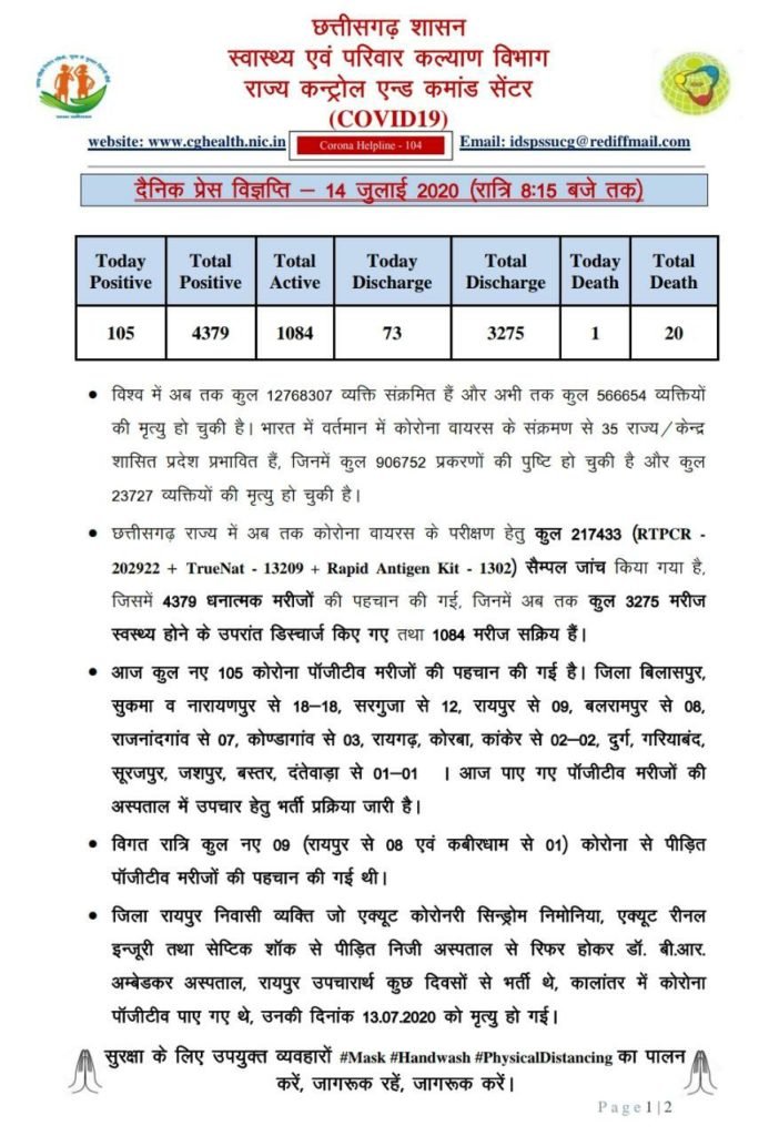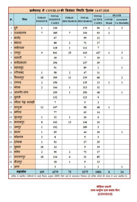 रायपुर। राज्य में आज विभिन्न जिलों से 105 कोरोना पॉजिटिव मरीजों की पहचान की गई है। वहीं 73 कोरोना संक्रमित मरीजों को स्वस्थ होने के बाद विभिन्न अस्पतालों से डिस्चार्ज कर दिया गया है।