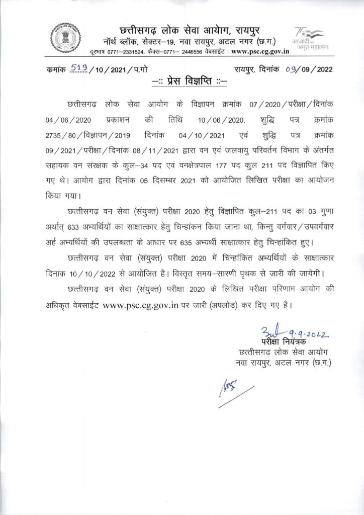 रायपुर। छत्तीसगढ़ राज्य लोक सेवा आयोग(पीएससी) ने शुक्रवार को छत्तीसगढ़ वन सेवा ( सयुंक्त) परीक्षा 2020 के नतीजे घोषित किए।
