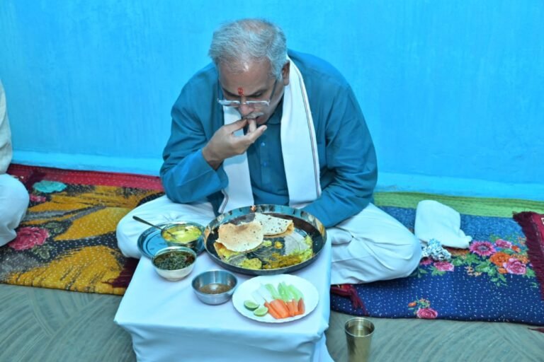 मुख्यमंत्री के लिए लजीज छत्तीसगढ़ी व्यंजन बनाए गए थे। प्रजापति ने मुख्यमंत्री को मिट्टी के चूल्हे पर बने ठेठ सरगुझिया थाली के व्यंजन चेंच लकड़ा की रस्सेदार सब्जी, उड़द दाल का बारा, जवाफूल चावल, अरहर दाल, आम की चटनी और पापड़ परोसे।