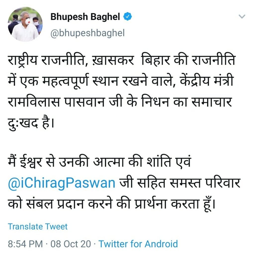 रायपुर। मुख्यमंत्री भूपेश बघेल ने केन्द्रीय खाद्य मंत्री रामविलास पासवान के निधन पर गहरा शोक जताया है। बघेल ने अपने शोक संदेश में कहा है कि राष्ट्रीय राजनीति, खासकर बिहार की राजनीति में एक महत्वपूर्ण स्थान रखने वाले, केंद्रीय मंत्री रामविलास पासवान जी के निधन का समाचार दुःखद है। मुख्यमंत्री ने ईश्वर से दिवंगत आत्मा की शांति और शोक संतप्त परिवारजनों को इस दुःख की घड़ी में संबल प्रदान करने की प्रार्थना की है।