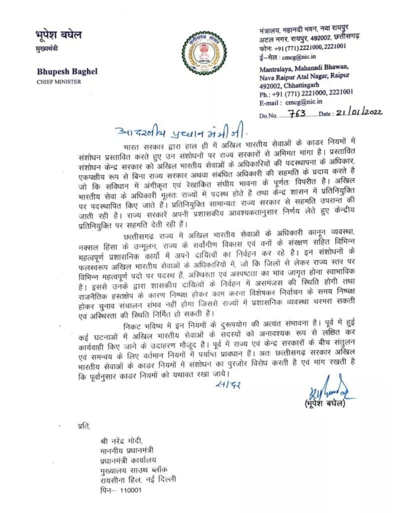रायपुर। मुख्यमंत्री भूपेश बघेल ने भारत सरकार द्वारा हाल ही में अखिल भारतीय सेवाओं के काडर नियमों में प्रस्तावित संशोधन के संबंध में प्रधानमंत्री नरेन्द्र मोदी को पत्र लिखा है। उन्होंने ने प्रधानमंत्री से अखिल भारतीय सेवाओं के काडर नियम को यथावत रखने का आग्रह किया है। मुख्यमंत्री ने अपने पत्र में इस बात का स्पष्ट रूप से उल्लेख किया है कि अखिल भारतीय सेवाओं के काडर नियमों में प्रस्तावित संशोधन से प्रशासनिक व्यवस्था चरमरा सकती है एवं अस्थिरता की स्थिति निर्मित हो सकती है।