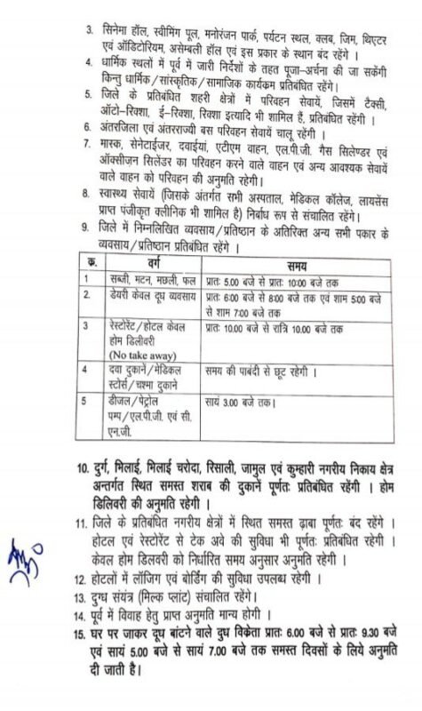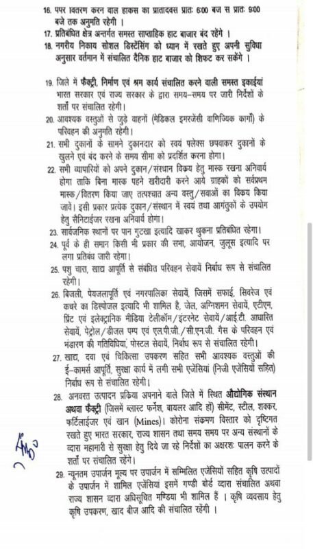 इस समय असावधानी बरती गई तो कोरोना संक्रमण की स्थिति को नियंत्रित करने में गंभीर परेशानी हो सकती है। कलेक्टर ने कल एक आदेश जारी कर लॉकडाउन में किन किन सुविधाओं का लाभ जनता को मिलेगा इसकी जानकारी दी है। वही किन बातों का ध्यान रखना है ये भी उस गाइडलाईन में है।