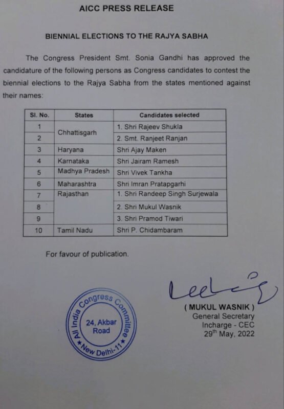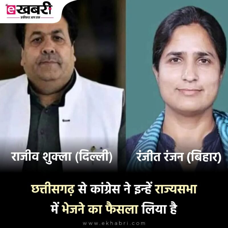रायपुर। राज्यसभा की दो सीटों पर होने वाले चुनाव के लिए कांग्रेस से छत्तीसगढ़ से राजीव शुक्ला और रंजीत रंजन को कांग्रेस ने राज्यसभा में भेजने का फैसला लिया है। छत्तीसगढ़ से भाजपा मैदान से लगभग बाहर है। कुछ दिनों से सोशल मीडिया में छाए लोकल नेता के नाम हुए बाहर। पार्टी आला कमान कमान ने पार्टी के बड़े चेहरों को उतारा मैदान में।