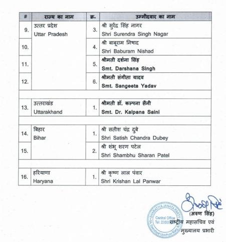 भाजपा की राष्ट्रीय इकई ने राज्यसभा चुनाव के लिए 9 राज्यों से अपने उम्मीदवारों की सूची जारी कर दी है। इस सूची में पार्टी के कई बड़े नाम है जैसे कर्नाटक से निर्मला सीतारमण, महाराष्ट्र से पीयूष गोयल के रूप में दो केंद्रीय मंत्रियों के नाम भी शामिल हैं।