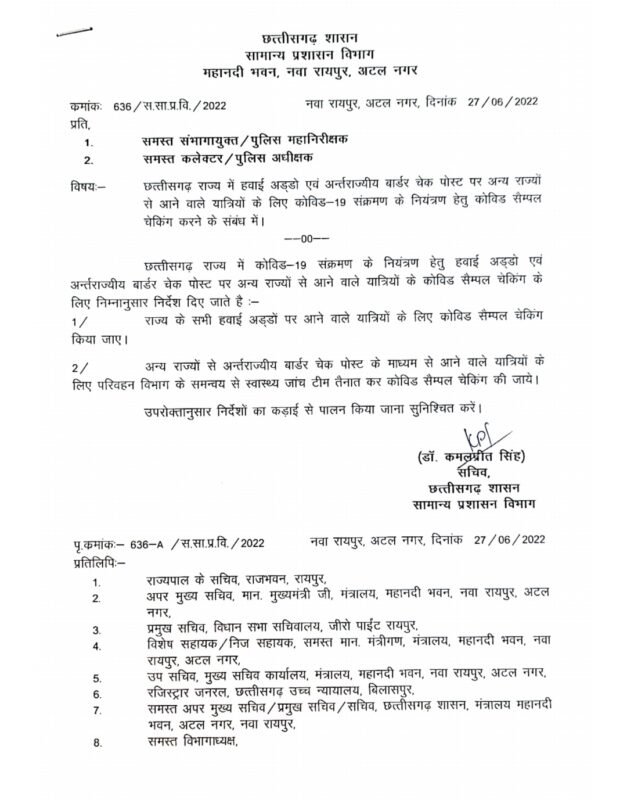 रायपुर। प्रदेश में बढ़ते कोरोना संक्रमण को देखते हुए राज्य सरकार फिर से प्रोटोकॉल जारी किया है। इसके लिए सभी कमिश्नर, आईजी, कलेक्टर और एसपी को इसके लिए निर्देश दिया है। सामान्य प्रशासन की तरफ से जारी आदेश के मुताबिक राज्य के सभी एयरपोर्ट पर आने वाले यात्रियों की कोरोना टेस्टिंग होगी। साथ ही राज्य से अंतर्राज्यीय बॉर्डर चेक पोस्ट के माध्यम से आने वाले यात्रियों के लिए परिवहन विभाग के साथ समन्यवय कर स्वास्थ्य जांच टीम तैनात कर कोविड सैंपल चेकिंग की जायेगी। अंतर्राज्यीय सीमा पर टेस्टिंग शुरू करने भी कहा गया है ।