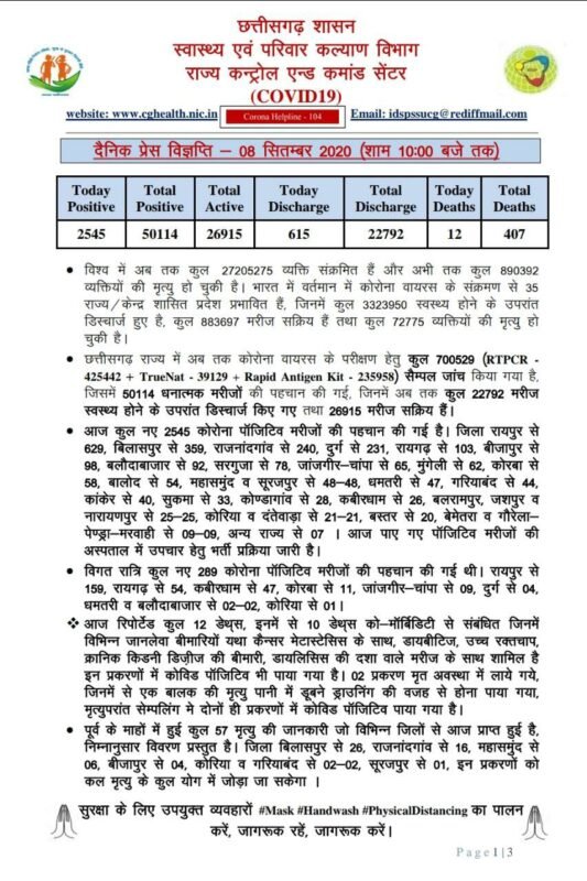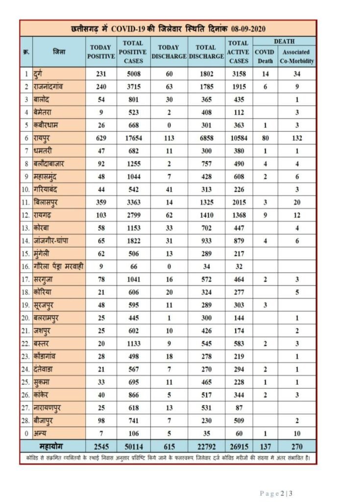 रायपुर। अभी स्वास्थ्य विभाग ने जारी की बुलेटिन जिसमें,प्रदेश में आज विभिन्न जिलों से 2545 कोरोना पॉजिटिव मरीजों की पहचान की गई है। वहीं 615 कोरोना संक्रमित मरीजों को स्वस्थ होने के बाद विभिन्न अस्पतालों से डिस्चार्ज कर दिया गया है। आंकड़े हुईं 50 हजार पार।