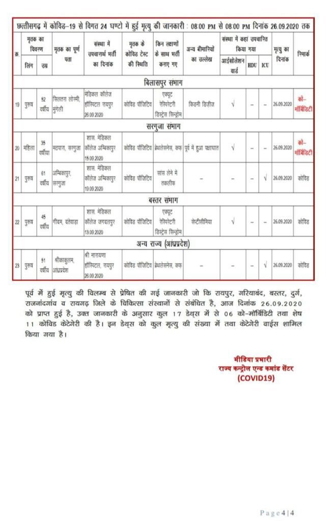स्वास्थ्य विभाग ने अपने मेडिकल बुलेटिन में यह जानकारी देते हुए बताया कि शनिवार को मिले 3896 नए कोरोना पॉजिटिव मरीजों में से जिला दुर्ग से 313, राजनांदगांव से 111, बालोद से 61, बेमेतरा से 34, कबीरधाम से 65, रायपुर से 891, धमतरी से 155, बलौदाबाजार से 76, महासमुन्द से 108, गरियाबंद से 62, बिलासपुर से 213, रायगढ़ से 281, कोरबा से 247, जांजगीर-चांपा से 183, मुंगेली से 42, गौरेला-पेंड्रा-मरवाही से 34, सरगुजा से 131, कोरिया से 41, सूरजपुर से 28, बलरामपुर से 47, जशपुर से 30, बस्तर से 188, कोण्डागांव से 103, दंतेवाड़ा से 99, सुकमा से 146, कांकेर से 127, नारायणपुर से 40, बीजापुर से 37 और अन्य राज्य से 3 मरीज शामिल हैं। प्रदेश में इस समय कोरोना के एक्टिव मरीजों की संख्या 30 हजार 689 है।