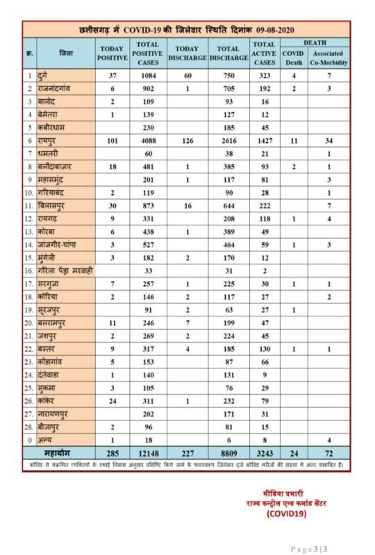 दुर्ग। जिले में कल देर रात तक कोरोना के 37 नये मरीज़ों की पहचान की गई है। एक पुरुष श्याम नगर दुर्ग से, एक महिला और एक पुरुष सेक्टर 6 महाराणाप्रताप चौक, तीन पुरुष और एक महिला पाटन दुर्ग से, एक महिला और एक पुरुष नगर निगम ज़ोन 3 से, एक पुरुष समोदा दुर्ग से, एक पुरुष मैत्री कुंज भिलाई से, एक पुरुष कुम्हारी से, एक पुरुष न्यू आदर्श नगर दुर्ग से, दो पुरुष और एक महिला कैम्प 2 भिलाई से, दो महिला और एक पुरुष वसुंधरा नगर भिलाई से, एक महिला वार्ड क्रमांक 27 सुपेला भिलाई से, एक पुरुष पदुम नगर चरोदा भिलाई से, एक पुरुष रिसाली भिलाई से, एक पुरुष सक्टर 6 से व अन्य कोरोना संक्रमित जिले के दूसरे भागों से पाए गए हैं।