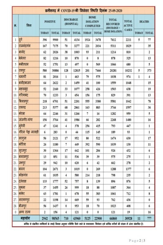 रायपुर। छत्तीसगढ़ राज्य में अब तक कोरोना वायरस के कुल 1015613 संभावित व्यक्तियों की पहचान कर सेंपल जांच किया गया है, अभी तक 98565 धनात्मक मरीजों की पहचान की गई, जिनमें अब तक कुल 66860 मरीज स्वस्थ्य होने के उपरांत डिस्चार्ज किए गए तथा 30928 मरीज सक्रिय है।