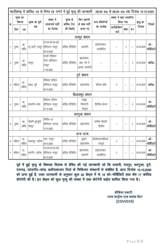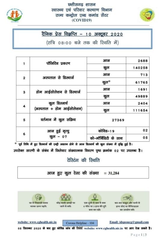 रायपुर। छत्तीसगढ़ में मंगलवार को 2688 कोरोना पॉजिटिव मरीजों की पहचान हुई है। 2404 मरीज स्वस्थ हुए हैं। 07 मरीजों की मौत हुई है। विभाग ने रात 8 बजे की स्थिति में मेडिकल बुलेटिन जारी की है। प्रदेश में अब तक 140258 मरीजों की पहचान हो चुकी है। इनमें से 111654 मरीज स्वस्थ हो चुके हैं। 1196 मरीजों की मौत हो चुकी है। प्रदेश में एक्टिव केस 27369 हैं।