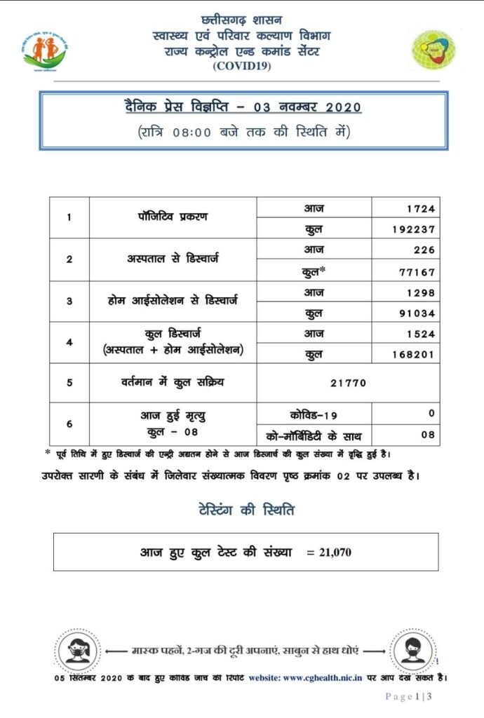 रायपुर। छत्तीसगढ़ में मंगलवार को 1724 कोरोना पॉजिटिव मरीजों की पहचान हुई है। 1524 मरीज स्वस्थ हुए हैं। आज थोड़ा कम 08 मरीजों की मौत हुई है। विभाग ने रात 8 बजे की स्थिति में मेडिकल बुलेटिन जारी की है। प्रदेश में अब तक 192237 मरीजों की पहचान हो चुकी है। इनमें से 168201 मरीज स्वस्थ हो चुके हैं। 2266 मरीजों की मौत हो चुकी है। प्रदेश में एक्टिव केस 21770 हैं।