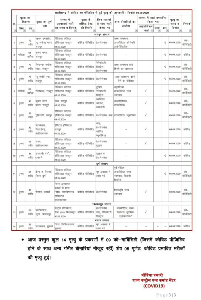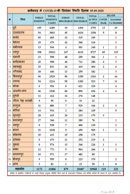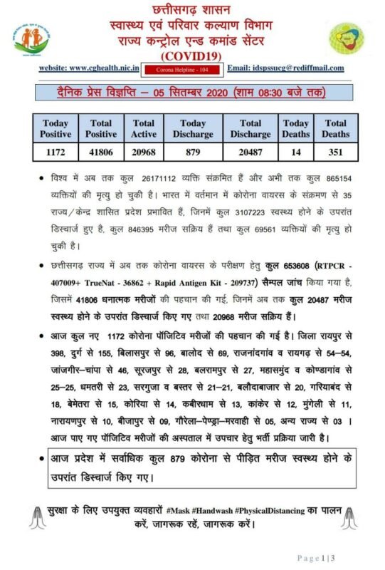 स्वास्थ्य विभाग ने अपने मेडिकल बुलेटिन में यह जानकारी देते हुए बताया कि आज पाए गए 1172 कोरोना संक्रमित मरीजों में से जिला रायपुर स 398 , दुर्ग से 155, बिलासपुर से 96, बालोद से 69, राजनांदगांव से 54, रायगढ़ से 54, जांजगीर-चांपा से 46, सूरजपुर से 28, बलरामपुर से 27, महासमुन्द से 25, कोण्डागांव से 25, धमतरी से 23, सरगुजा से 21, बस्तर से 21, बलौदाबाजार से 20, गरियाबंद से 18, बेमेतरा से 15, कोरिया से 14, कबीरधाम से 13, कांकेर से 123, मुंगेली से 11, नारायणपुर से 10, बीजापुर से 9, गौरेला-पेंड्रा-मरवाही से 5, और अन्य राज्य से 3 मरीज शामिल हैं।