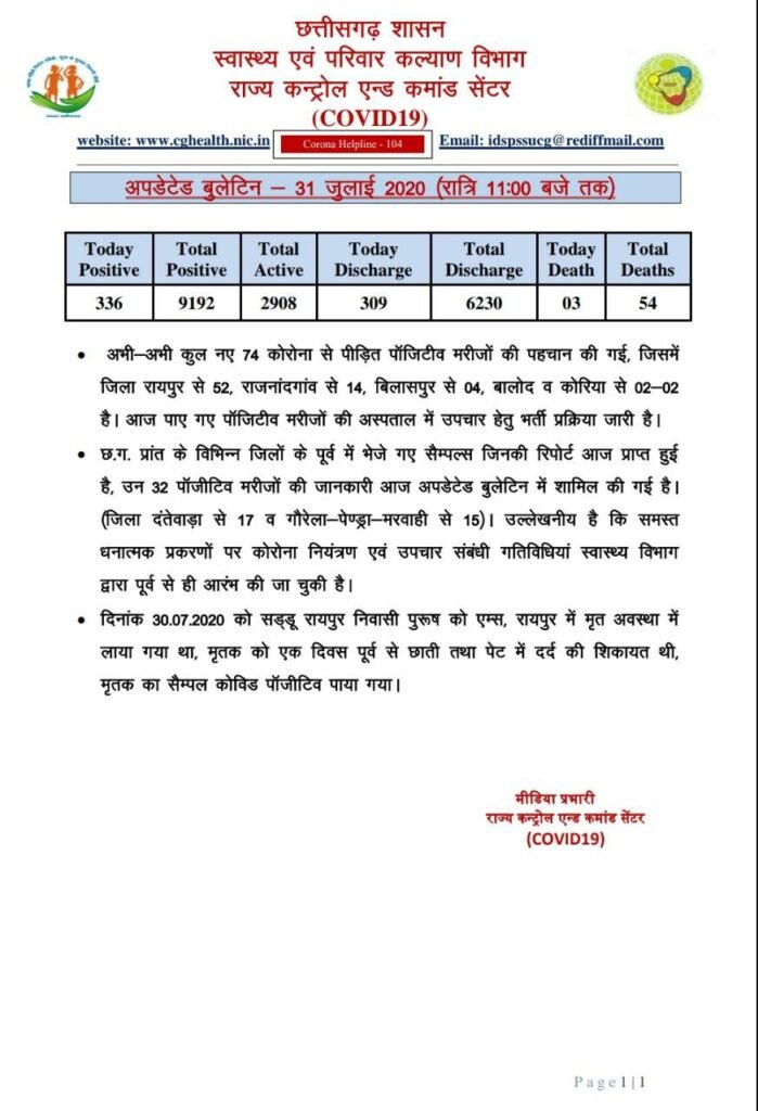 रायपुर। अभी अभी देर रात प्रदेश सरकार द्वारा जारी रिपोर्ट में विभिन्न जिलों से 336 कोरोना पॉजिटिव मरीजों की पहचान की गई है। वहीं 309 कोरोना संक्रमित मरीजों को स्वस्थ होने के बाद विभिन्न अस्पतालों से डिस्चार्ज कर दिया गया है। वहीं आज 3 कोरोना संक्रामित की मौत हो गई।