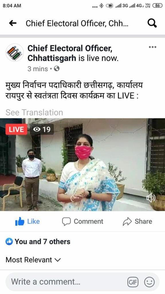कोरोना काल मे मुख्य निर्वाचन पदाधिकारी छत्तीसगढ़, कार्यालय रायपुर द्वारा Social Distancing के तारतम्य में स्वतंत्रता दिवस कार्यक्रम का Facebook Live के माध्यम से प्रसारण।