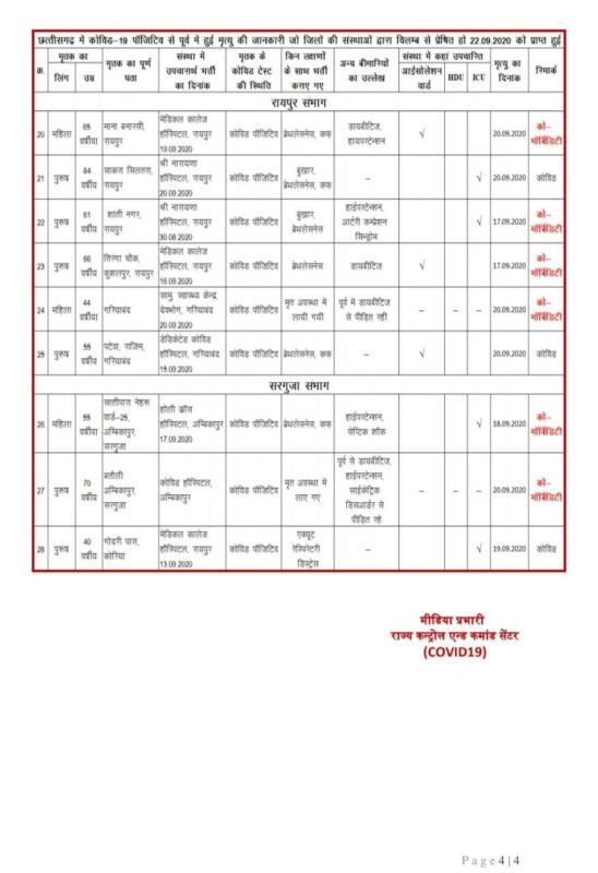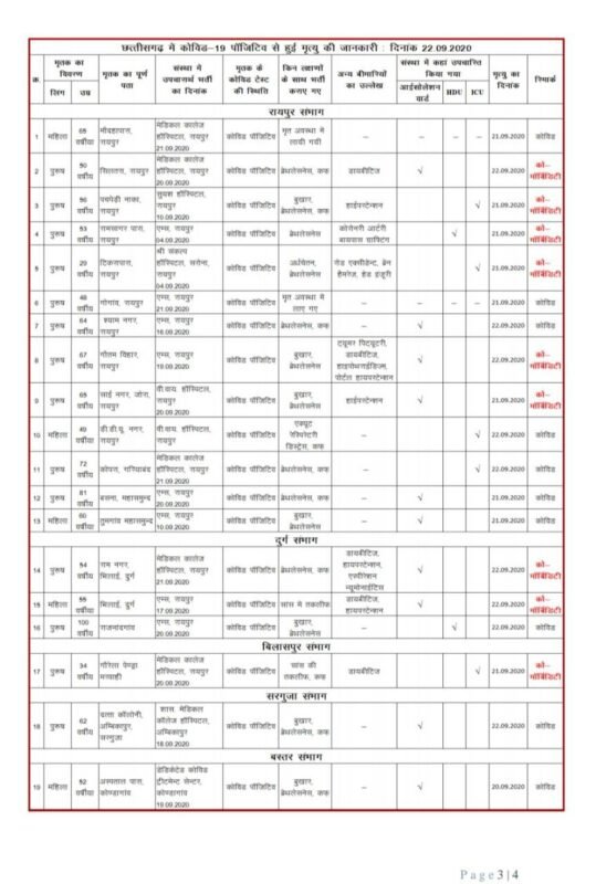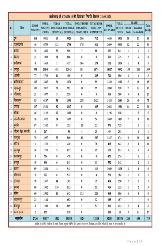 स्वास्थ्य विभाग ने अपने मेडिकल बुलेटिन में यह जानकारी देते हुए बताया कि मंगलवार को मिले 2736 कोरोना संक्रमितों में जिला रायपुर से 958, दुर्ग से 418, रायगढ़ से 197, बलौदाबाजार से 125, महासमुन्द से 105, सुकमा से 86, बिलासपुर से 83, सरगुजा से 79, दंतेवाड़ा से 78, धमतरी से 77, बालोद से 70 , मुंगेली से 67, कांकेर से 60, बस्तर से 59, जशपुर से 48, कोरबा से 46, राजनांदगांव से 40 , सूरजपुर से 36, जांजगीर-चांपा से 26, नारायणपुर से 24, बेमेतरा से 21, गरियाबंद से 21, बलरामपुर से 5, कबीरधाम से 4, कोरिया से एक और अन्य राज्य से 2 मरीज शामिल हैं। मंगलवार को पाए गए सभी मरीजों की अस्पतालों में भर्ती प्रक्रिया जारी है। प्रदेश में इस समय कोरोना के एक्टिव मरीजों की संख्या 38 हजार 198 है। स्वास्थ्य विभाग ने बताया कि प्रदेश में पिछले 24 घंटों के दौरान कोरोना संक्रमण स 13 और विभिन्न बीमारियों से पीडि़त कोरोना पॉजिटिव 15 मरीजों की मृत्यु हुई है। इस प्रकार कुल 28 लोगों की मौत हुई है।