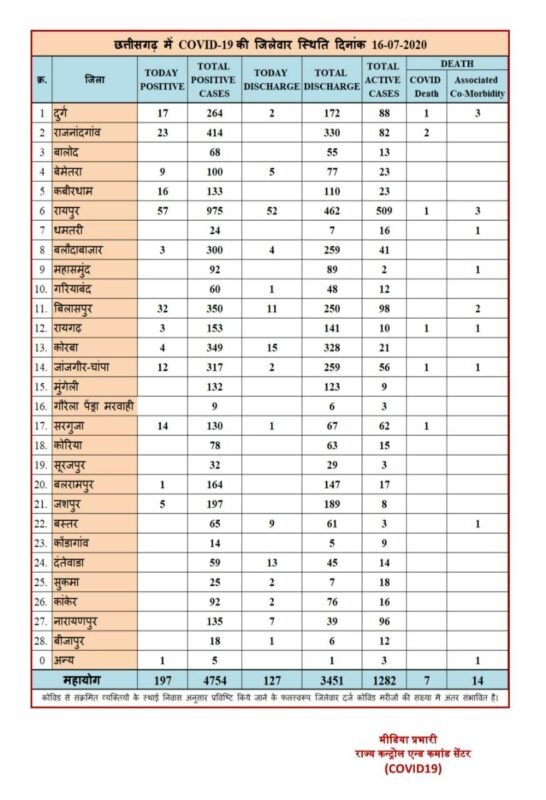 रायपुर। राज्य में कोरोना मरीज़ों में लगातार वृद्धि होती चली जा रही है। इसी बीच स्वास्थ्य विभाग ने डेली मेडिकल बुलेटिन जारी किया है। स्वास्थ्य विभाग ने आज के कोरोना मरीज़ों स्थिति की जानकारी देते हुए बताया की प्रदेश में आज कुल 197 नए मरीज़ मिले हैं। वहीँ ठीक हो कर घर जाने वालों की संख्या 127 है।
