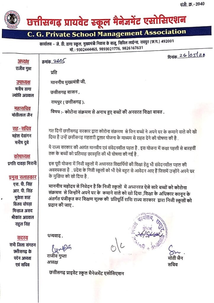 रायपुर। कोरोना महामारी में बच्चों की पढ़ाई पैसों के कारण नहीं रुकेगी।कोरोना ने कई ऐसे घर के मुखिया को छीन लिया है जिनसे उनके घर का खर्च चलता था। ऐसे बच्चों के लिए छत्तीसगढ़ प्राइवेट स्कूल मैनेजमेंट एसोसिएशन ने मुख्यमंत्री से भी मदद की अपील की थी।