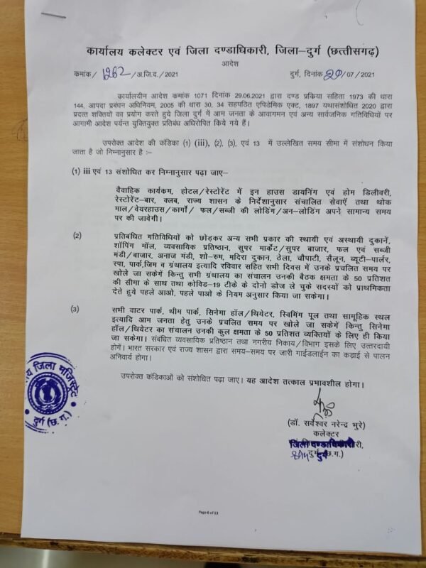 दुर्ग कलेक्टर ने वाटर पार्क, लाइबेरी और थियेटर जैसे जगहों में अभी भी 50 प्रतिशत की उपस्तिथि और कोविड वैक्सीन लगवा चुके लोगो को प्राथमिकता देने का निर्देश जारी किया है।