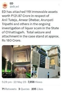 ED ने छत्तीसगढ़ राज्य में शराब घोटाले की चल रही जांच में अनिल टुटेजा, अनवर ढेबर, अरुणपति त्रिपाठी और अन्य के संबंध में ₹121.87 करोड़ की 119 अचल संपत्ति कुर्क की है।