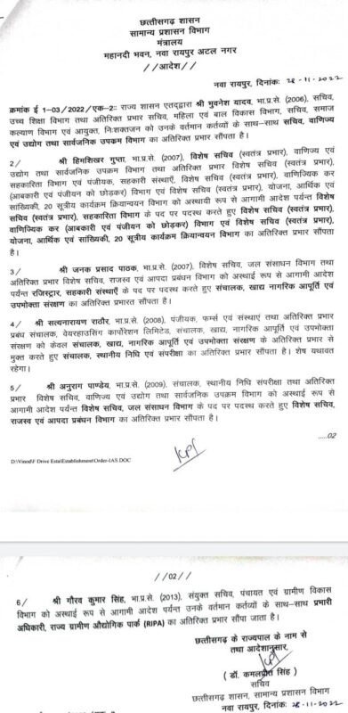Ekhabri ब्रेकिंग: हिमशिखर गुप्ता,जगन्नाथ प्रसाद पाठक संग अन्य आईएएस के प्रभार में बदलाव
