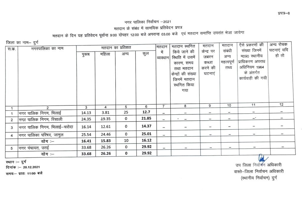 नगर पालिक निगम 1.बीरगांव- 35.00 2.भिलाई – 17.57 3.रिसाली-26.24 4.भिलाई चरोदा -30.89 नगर पालिका परिषद 1. शिवपुर चरचा-37.39 2.जामुल (दुर्ग) -अपडेट हो रहा है 3.सारंगढ़ (रायगढ़) – 38.13 4 बैकुंठपुर (कोरिया) -38.94 5 खैरागढ़ (राजनांदगांव) -43.07 नगर पंचायत 1.प्रेमनगर(सूरजपुर) – 71.09 2.नरहरपुर (कांकेर)- 74.86 3.कोंटा (सुकमा)-72.25 4.भैरमगढ़ (बीजापुर)-अपडेट हो रहा है 5 .भोपालपट्टनम( बीजापुर)- अपडेट हो रहा है 6.मारो(बेमेतरा)-अपडेट हो रहा है