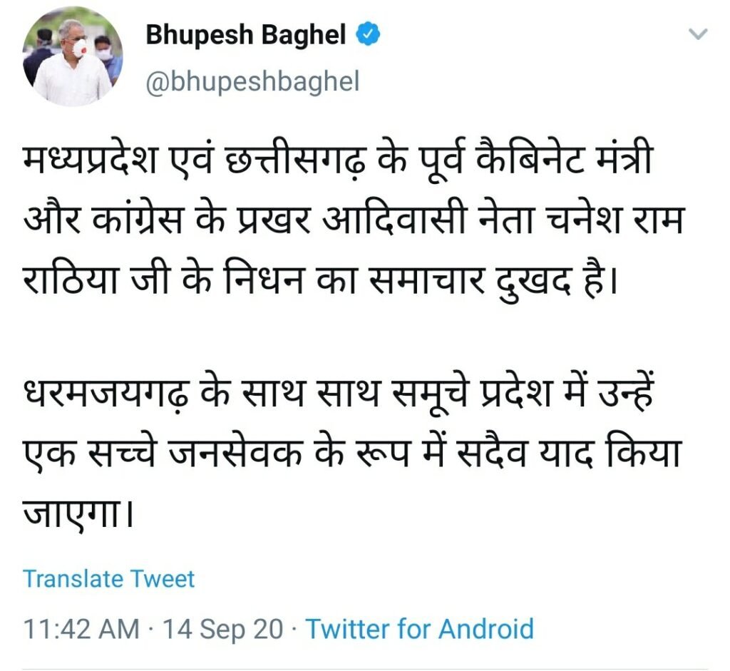 रायपुर।। मध्यप्रदेश एवं छत्तीसगढ़ के पूर्व कैबिनेट मंत्री और कांग्रेस के प्रखर आदिवासी नेता चनेश राम राठिया का आज निधन हो गया। उनके निधन पर मुख्यमंत्री भूपेश बघेल ने शोक जताया है। ट्वीट कर कहा- धरमजयगढ़ के साथ साथ समूचे प्रदेश में उन्हें एक सच्चे जनसेवक के रूप में सदैव याद किया जाएगा।