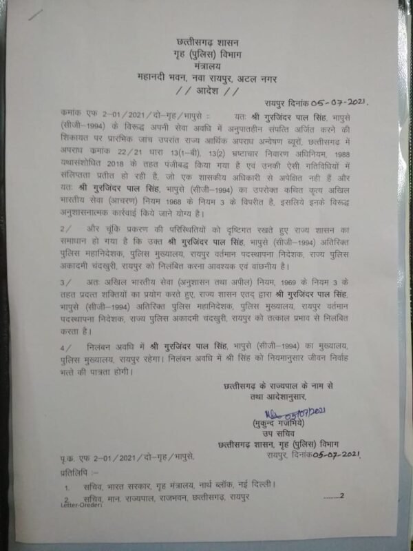 रायपुर। सोमवार देर रात राज्य शासन ने एडीजी जीपी सिंह को निलंबित कर दिया। करीब 11 बजे आदेश जारी हुआ। जारी आदेश में आईपीएस जीपी सिंह के पास अनुपातहीन संपति की शिकायत, प्रशासनिक अधिकारी के तौर पर उनके कृत्यों और कार्यप्रणाली को सवालों में रखा गया।