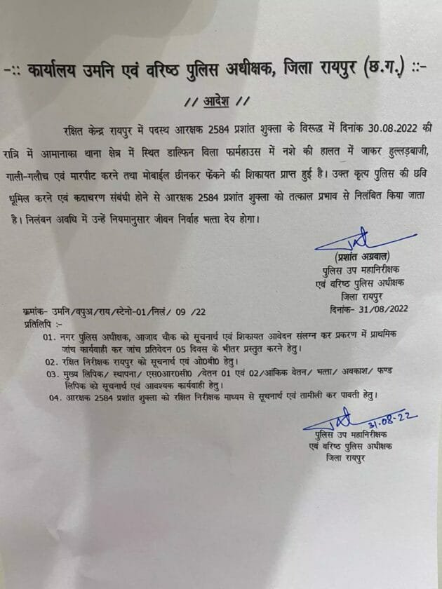 रायपुर। नशे में आरक्षक का हुल्लड़ करना उसके लिए भारी पड़ा। मामला राजधानी का है, जहां एक पार्टी में यह घटना हुई। राजधानी के आमानाका थाना क्षेत्र स्थित डाॅल्फिन विला फाॅर्म हाउस में नशे की हालत में हुल्लड़बाजी करने, गाली- गलौच, मारपीट करने का वीडियो वायरल होने के बाद एसएसपी प्रशांत अग्रवाल ने आरक्षक प्रशांत शुक्ला को निलंबित कर दिया है। निलंबित आरक्षक पुलिस लाइन में पदस्थ था।