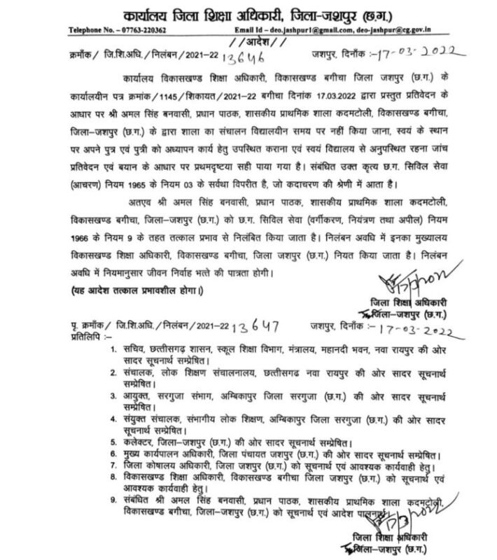 जशपुर। जिले के बगीचा ब्लॉक के कदमतोली प्राथमिक शाला के प्रधान पाठक अमल सिंह वनवासी ने अलग ही लापरवाही की है। उसका नतीजा है की उन्हें निलंबित कर दिया गया है। शिक्षक पर आरोप है की वह खुद स्कूल ना जाकर अपनी जगह बेटी को पढ़ाने भेज देते थे। लगातार यह शिकायत बच्चों और पलकों द्वारा दी जा रही थी, जिस पर एक्शन लेते हुए आदेश जारी किया है।