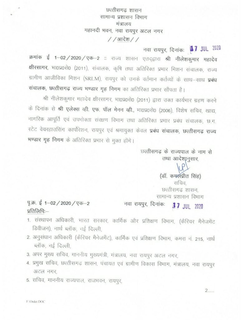प्रथम आदेश में नीलेश कुमार महादेव क्षीरसागर,आईएएस, को संचालक, कृषि तथा अतिरिक्त प्रभार मिशन संचालक, राज्य ग्रामीण आजीविका मिशन, रायपुर को अतिरिक्त प्रभार संचालक, छत्तीसगढ़ राज्य भंडार गृह निगम दिया गया है।