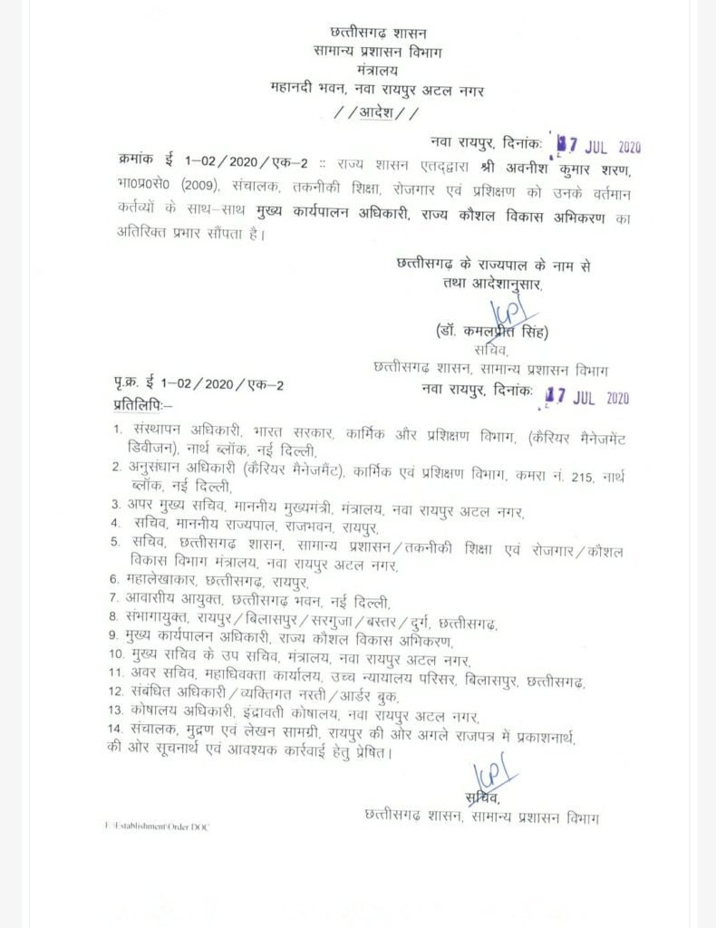 वंही दूसरे आदेश में अवनीश कुमार शरण, आईएएस को संचालक तकनीकी शिक्षा, रोजगार एवं प्रशिक्षण के साथ- साथ मुख्य कार्यपालन अधिकारी, राज्य कौशल विकास मिशन विकास अभिकरण का अतिरिक्त प्रभार होगा।