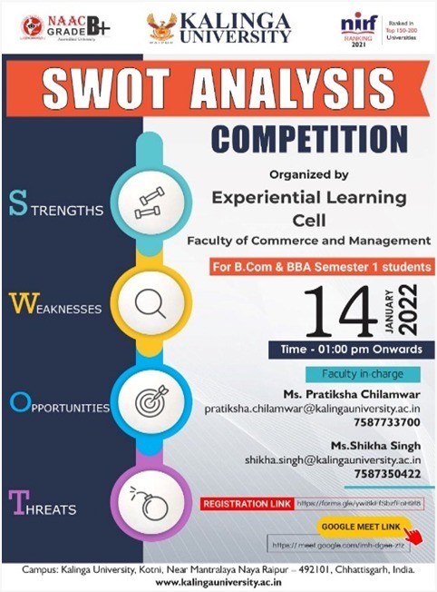 रायपुर। कलिंगा विश्वविद्यालय के वाणिज्य एवं प्रबंधन संकाय ने हाल ही में एमबीए और एम.कॉम प्रथम सेमेस्टर के छात्रों के लिए स्थिति विश्लेषण, स्वोट विश्लेषण और प्रेजेंटेशन स्किल्स पर प्रतियोगिता का आयोजन किया। जिसमें छात्रों ने बढ़-चढ़कर हिस्सा लिया। इस प्रतियोगिता का मुख्य उद्देश्य छात्रों के शैक्षणिक स्थिति को बढ़ाना है। इस प्रतियोगिता के माध्यम से छात्रों ने अपने मनोस्थिति का विश्लेषण करके प्रस्तुतिकरण के बारे में अंतदृष्टि सीखी। स्थिति विश्लेषण कार्यक्रम ने सिखाया कि लोगों के बीच किसी भी गतिविधि को कैसे बढ़ावा दिया जाए। यह संचार कौशल के साथ-साथ प्रस्तुति कौशल में भी सुधार करता है। स्वोट को हिन्दी में ताकत (Strength), कमजोरियां (Weakness), अवसर (Opportunities), और खतरे (Threats) कहते है जो प्रतिस्पर्धी स्थिति का मूल्यांकन करने और रणनीतिक योजना विकसित करने के लिए उपयोग किया जाने वाला एक ढ़ाचा है। स्वोट विश्लेषण विद्यार्थीयों के आतंरिक और बाहरी कारकों के साथ ही वर्तमान और भविष्य की क्षमता का आंकलन करता है। यह प्रतियोगिता छात्रों के कौशल विकास में वृद्धि के लिए बहुत ही उपयोगी जनक सिद्ध हुई। शैक्षणिक प्रकोष्ठ के तहत ऑनलाईन प्रेजेंटेशन स्किल्स प्रतियोगिता का भी आयोजन किया गया। इस तरह की अतिरिक्त सह-पाठ्यचर्या संबंधी गतिविधियां हमारे छात्रों के आत्मविश्वास और भागीदारी कौशल को बढ़ाती है। इस प्रतियोगिता में किसी भी विषय को लोगों के बीच कैसे प्रस्तुत करना है उसे पीपीटी के माध्यम से सिखाया गया। सभी प्रतिभागियों ने ऑनलाईन प्रेजेंटेशन के माध्यम से अपनी-अपनी विषय वस्तु प्रस्तुत किये।