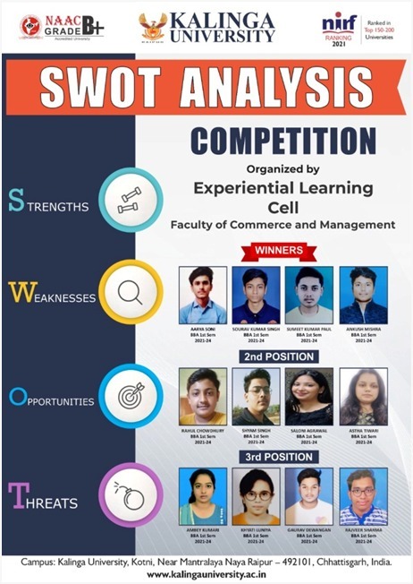 स्वोट विश्लेषण प्रतियोगिता में सुमीत कुमार पॉल, आर्या सोनी, अंकुश मिश्रा और सौरव कुमार सिंह ने प्रथम स्थान प्राप्त किये। इसी क्रम में राहुल चौधरी, श्याम सिंह, आस्था तिवारी, सलोनी अग्रवाल ने द्वितीय स्थान और राजवीर शर्मा, अंबे कुमारी, गौरव देवांगन, ख्याति जैन ने तृतीय स्थान प्राप्त किये।