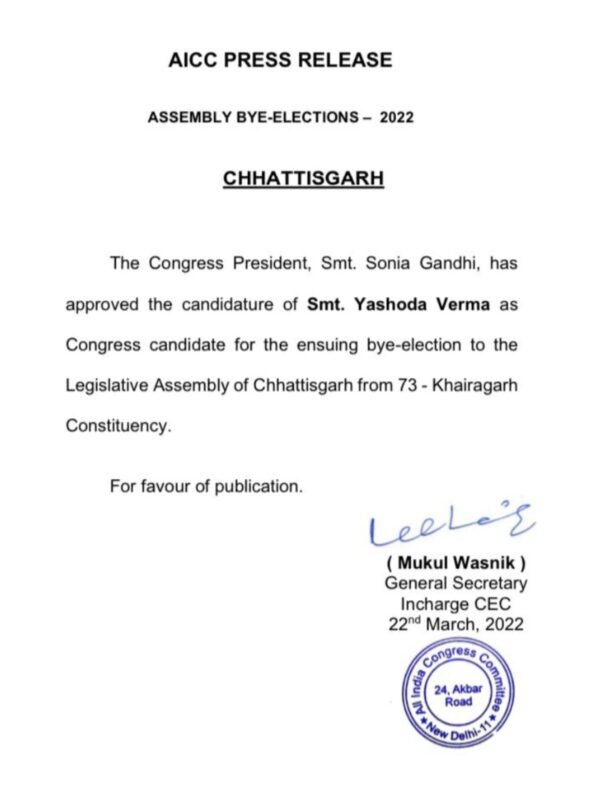 रायपुर। खैरागढ़ विधानसभा उपचुनाव के लिए मंगलवार को कांग्रेस ने प्रत्याशी का ऐलान किया. कांग्रेस ने खैरागढ़ में यशोदा वर्मा को अपना अधिकृत प्रतयाशी बनाया है। वर्मा 24 मार्च को मुख्यमंत्री भूपेश बघेल की मौजूदगी में नामांकन दाखिल करेगी।